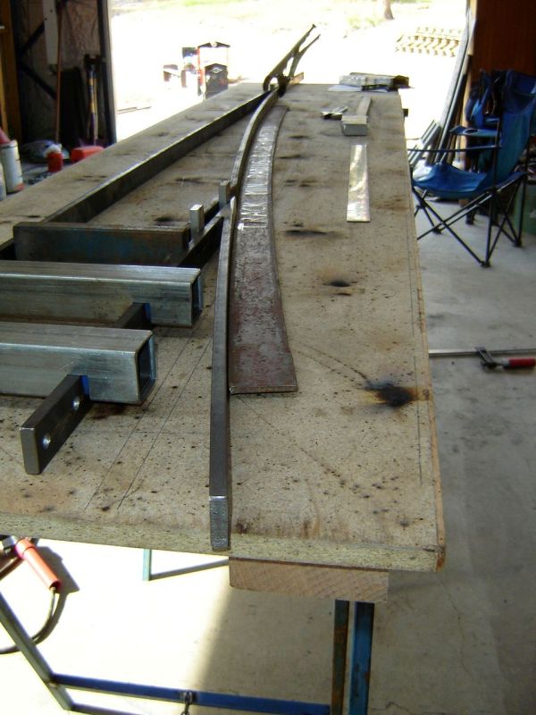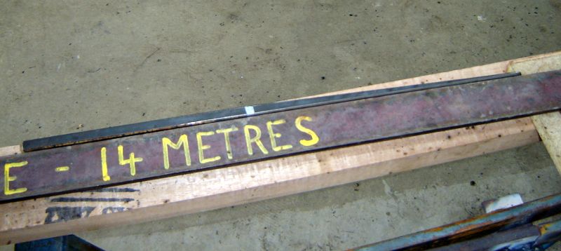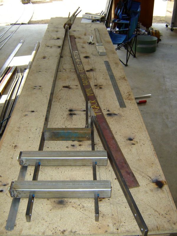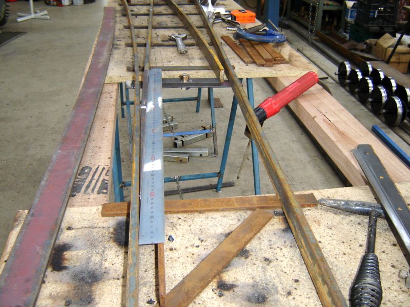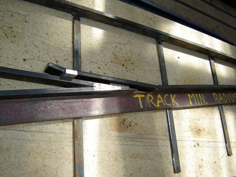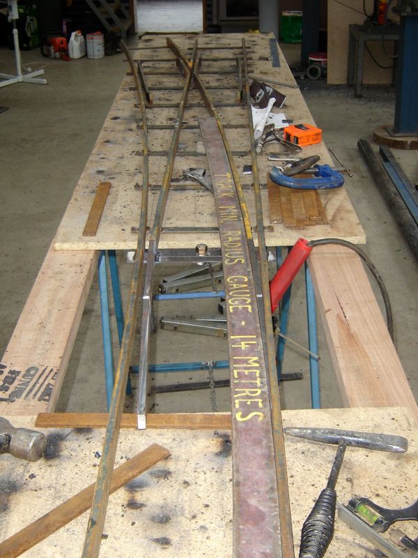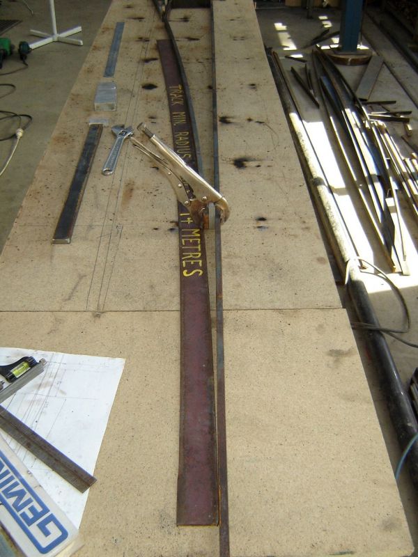 While you rolling rail, roll a radius gauge which is long enough to cover at least 3/4 of the length of your points. I used a piece of 50mm x 5mm flat and rolled it on its edge to make a 14 metre radius gauge.