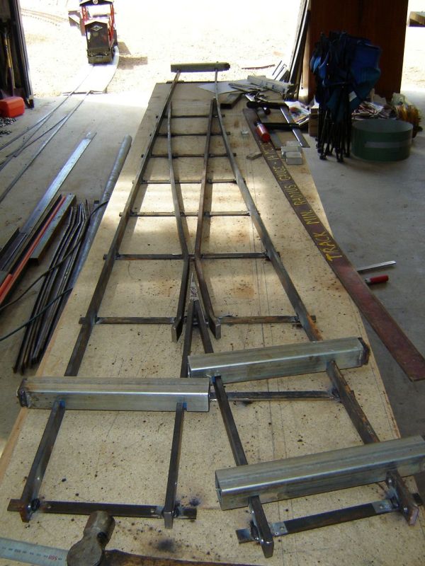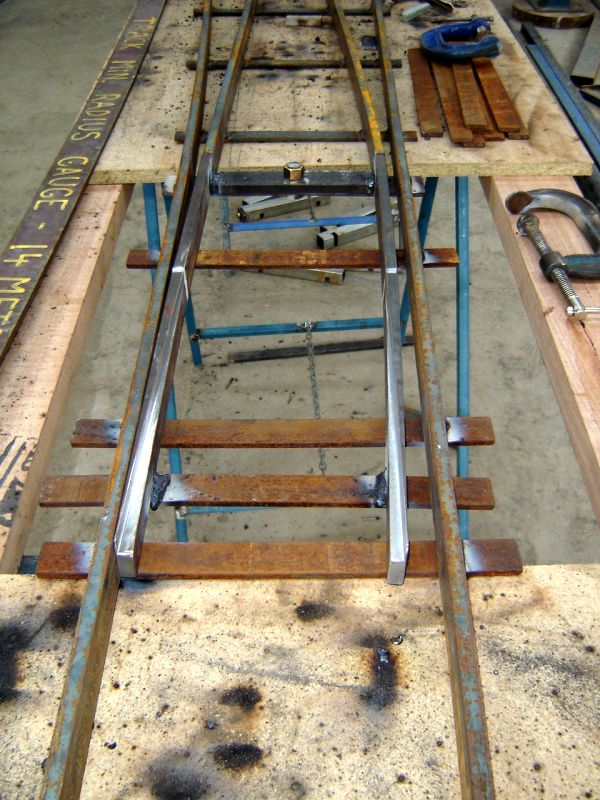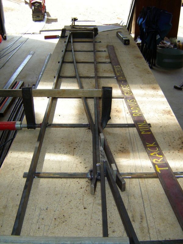A set of points will use approximately three times there own length in rail plus the ties (the small metal sleepers that the rail is welded to before being screwed onto the timber sleepers) and of course the timber sleepers. I use 32mm x 10mm flat bar for the rail on the Boulder Creek Tramway and this is welded to 20mm x 5mm flat bar for the ties. These are screwed to 90mm x 45mm treated pine sleepers at 250mm centres.